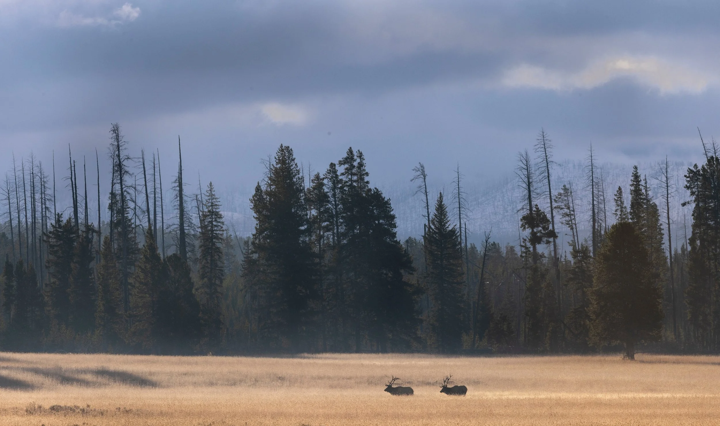 Seven members of the Wapiti Pack linger near an elk they've killed, feeding, resting, and interacting with one another, offering a glimpse into the rhythm and social life of the pack as late fall settles and winter begins to take hold.
